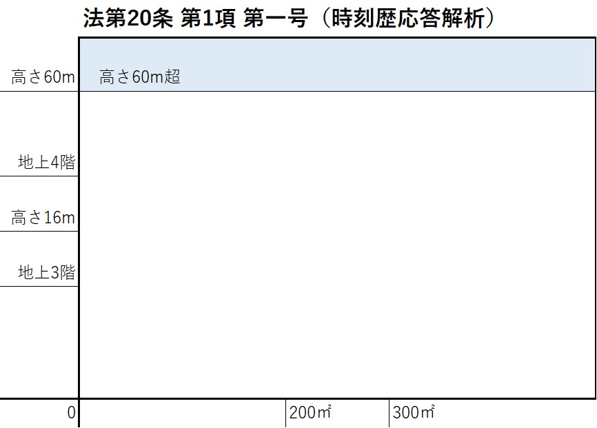 - 法第20条 第1項 第一号 に該当する建築物では、仕様規定(耐久性等関係規定のみ)への適合と時刻歴応答解析による安全性の確認が必要となります。